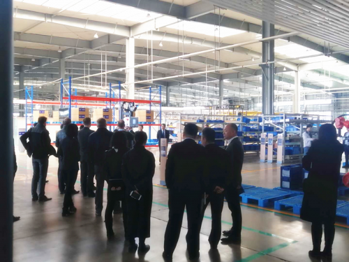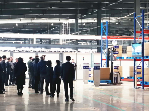 圖為一汽及大眾汽車的領(lǐng)導(dǎo)參觀Geek+無人叉車作業(yè)